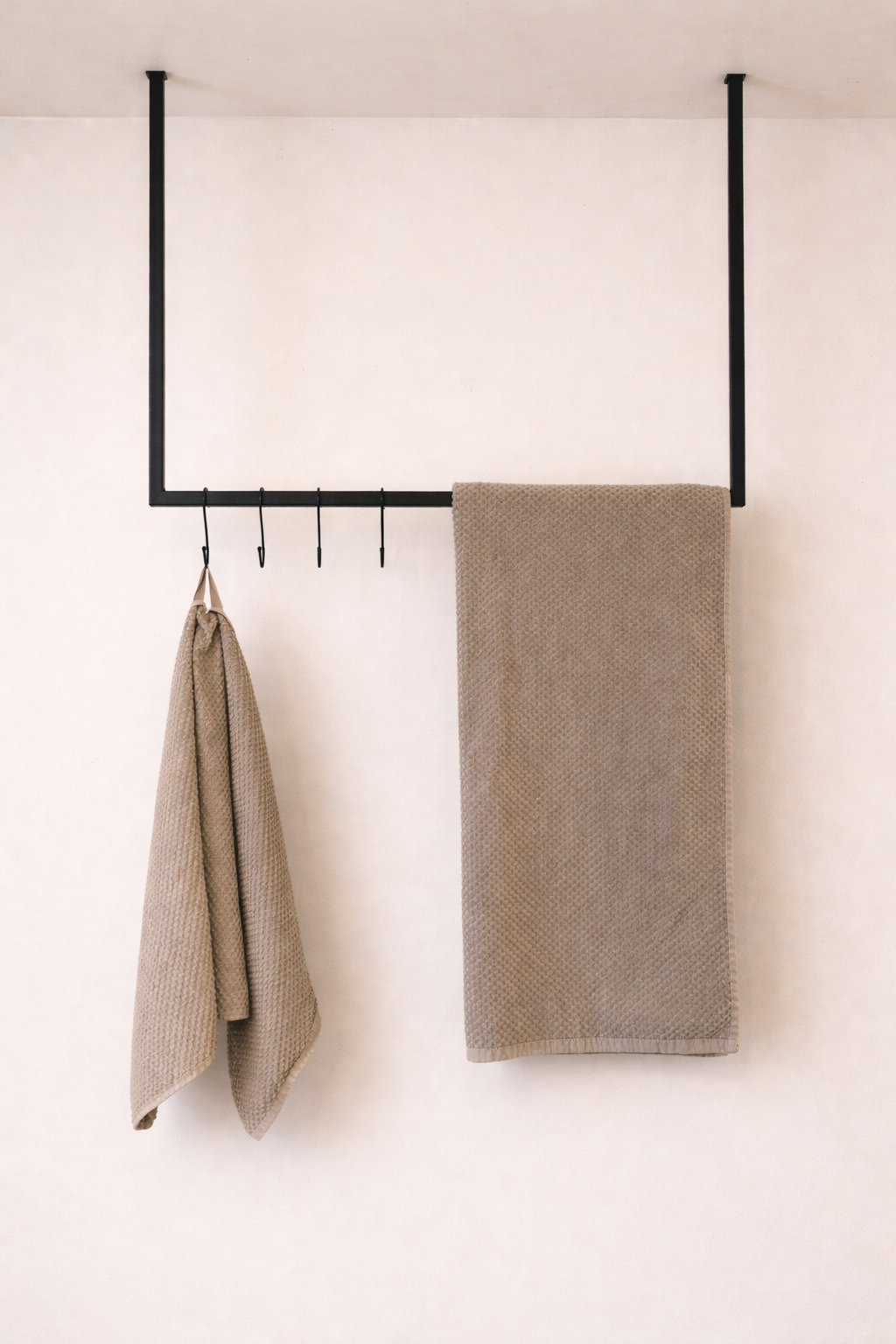 Die fein strukturierte Pulverbeschichtung ist kratzfest und pflegeleicht. Sie verleiht der Oberfläche eine matte, hochwertige Haptik und schützt zuverlässig im täglichen Gebrauch, ideal als Handtuchhalter im Bad, Garderobe im Flur oder Kleiderstange im Schlafzimmer.